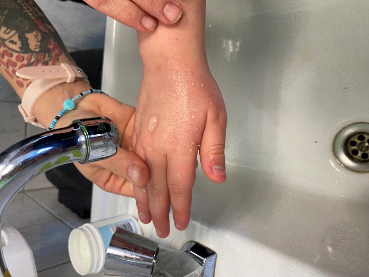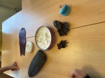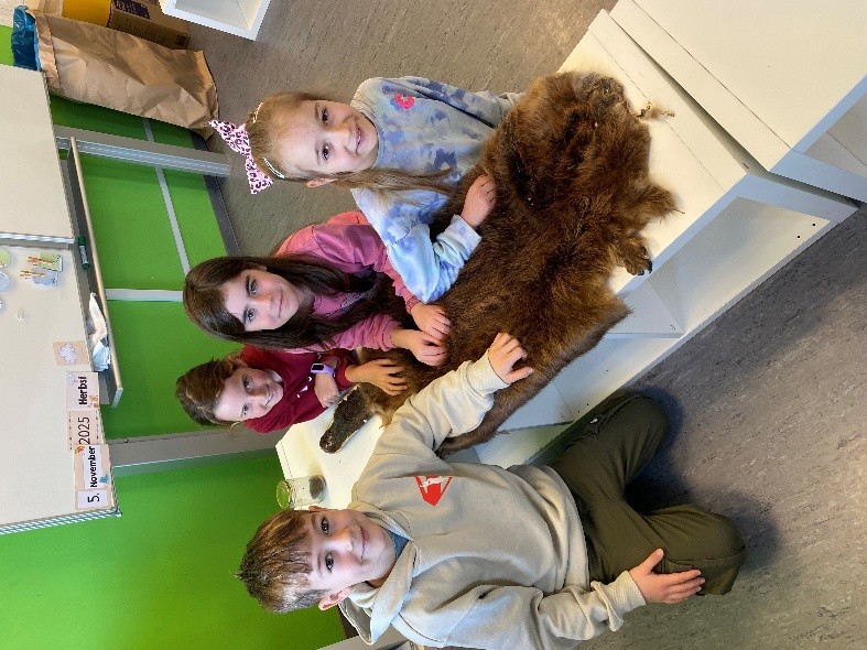 Spannend: der Biber verbringt viel Zeit mit Fellpflege. Er reibt Castoreum, ein öliges Sekret, in sein dichtes Fell ein, um eine Fettschicht zu erzeugen, die das Eindringen von Wasser verhindert und ihn vor Kälte schützt. Hier wird die Wirkung mithilfe von Vaseline und Wasser auf den Händen der Kinder verdeutlicht.
